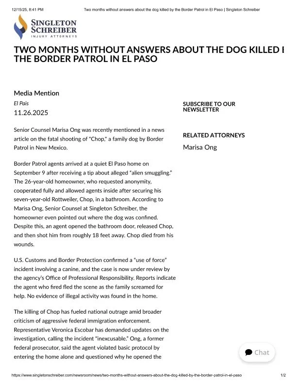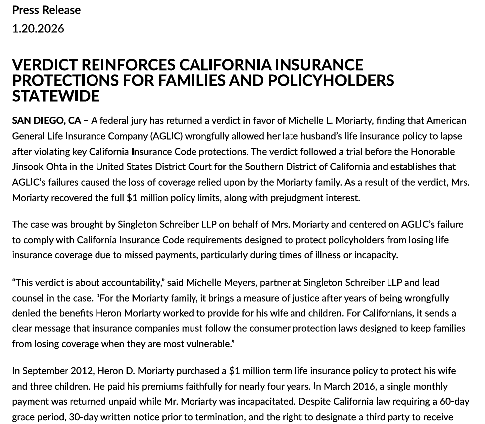 Singleton Schreiber is a client-centered law firm specializing in mass torts and multidistrict litigation, personal injury and wrongful death, civil rights, and environmental law. The firm focuses on protecting individuals from corporate wrongdoing and brings substantial resources and experience to every case.